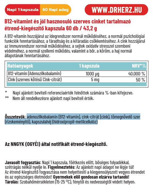Összetevők: adenozilkobalamin (B12-vitamin), cink-citrát (cink), tömegnövelő szer (rizskeményítő), kapszulahéj (hidroxipropil-metilcellulóz)