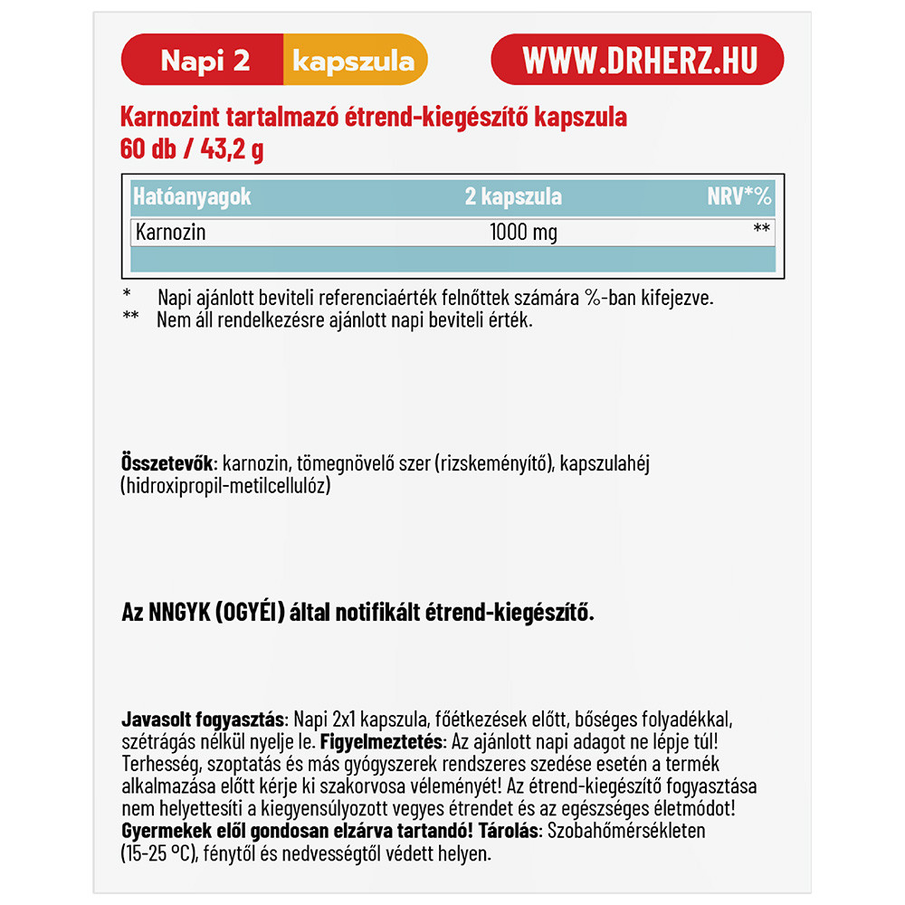 Összetevők: karnozin, tömegnövelő szer (rizskeményítő), kapszulahéj (hidroxipropil-metilcellulóz)
