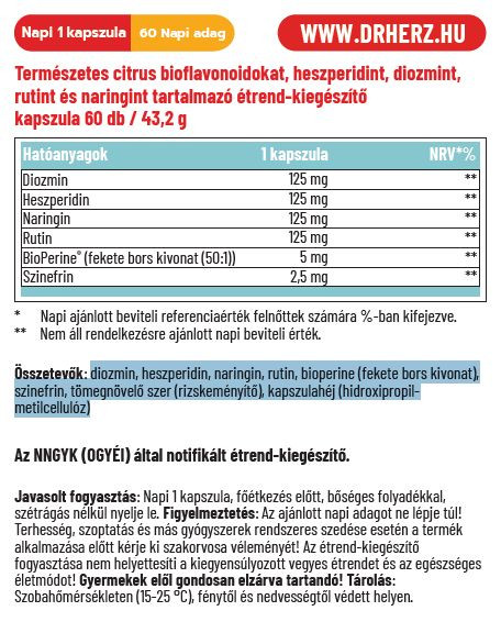 - funkcionális bioflavonoidokat hezperidint, diozmint, szinefrint, rutint és naringint tartalmaz