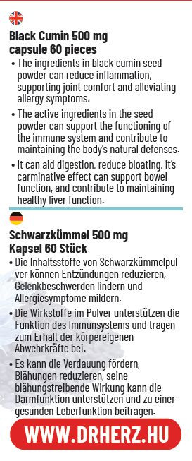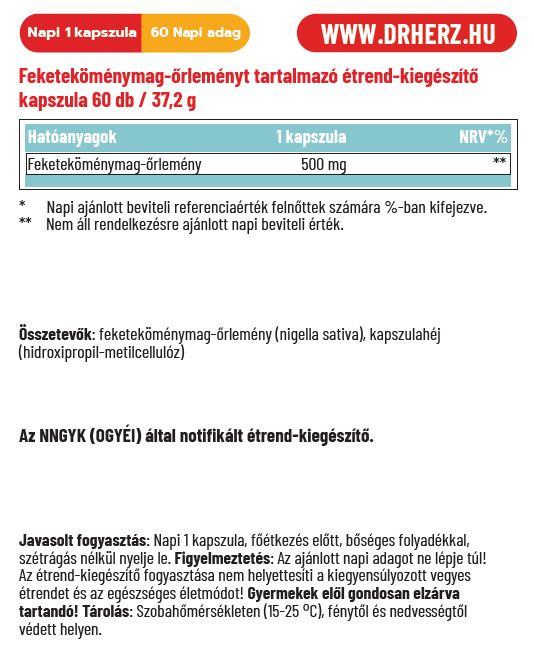 Összetevők: egyiptomi feketekömény őrlemény (Nigella sativa), kapszulahéj: hydroxipropil-metilcellulóz