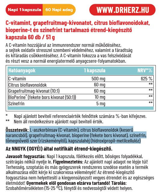 Összetevők: L-aszkorbinsav (C-vitamin), citrus bioflavonoidok (keserű narancsból), grapefruitmag-kivonat, bioperine (fekete bors kivonat), szinefrin, tömegnövelő szer (rizskeményítő), kapszulahéj (hidroxipropil-metilcellulóz)