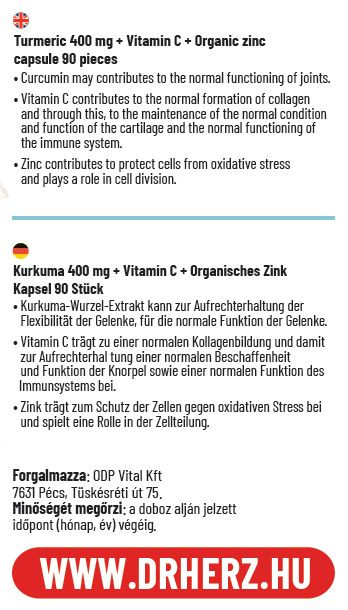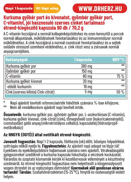 Összetevők: kurkuma gyökér por, gyömbér gyökér por, L-aszkorbinsav(C-vitamin), kurkuma gyökér kivonat, cink-citrát (cink), tömegnövelő szer (kukoricakeményítő), csomósodást gátló anyag (mikrokristályos cellulóz), kapszulahéj hidroxipropil-metil-cellulóz
