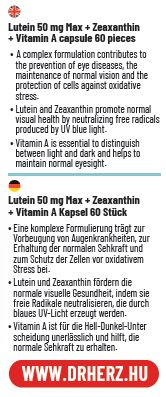 A Dr.Herz Lutein 50mg MAX kapszula magában foglalja a luteint, zeaxantint és A-vitamint, amelyek kulcsfontosságú tápanyagok a szem védelme és optimális működése szempontjából.