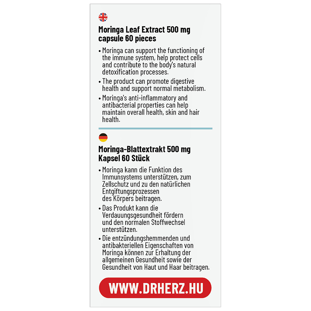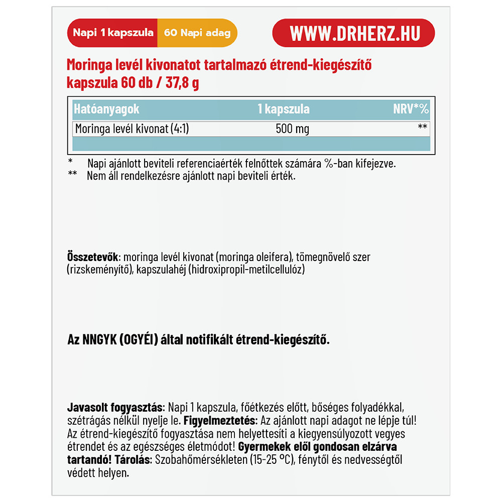 Összetevők: moringa levél kivonat (moringa oleifera), tömegnövelő szer (rizskeményítő), kapszulahéj (hidroxipropil-metilcellulóz)