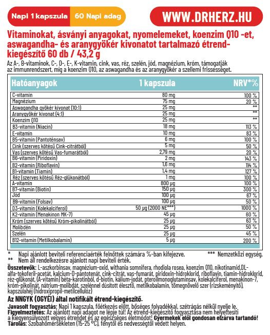 Az A-, B-, C-, D-, E- és K-vitaminok, valamint a cink, vas, réz, szelén, jód, magnézium és króm hozzájárulnak az immunrendszer normál muködéséhez, míg a koenzim Q10, az ashwagandha és az aranygyökér a mentális teljesítmény és szellemi frissesség fenntartását támogatják.