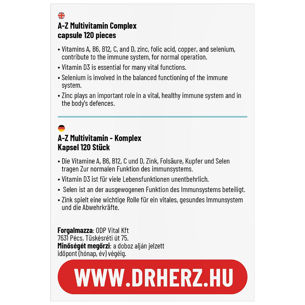 Az egészség megőrzéséhez és a teljesítőképesség növeléséhez elengedhetetlen a megfelelő tápanyagok fogyasztása. Napi egy szem Dr. Herz A-Z multivitamin kapszula tartalmazza mindazokat a vitaminokat, ásványi anyagokat és nyomelemeket, amelyre egy felnőtt szervezetének szüksége van.