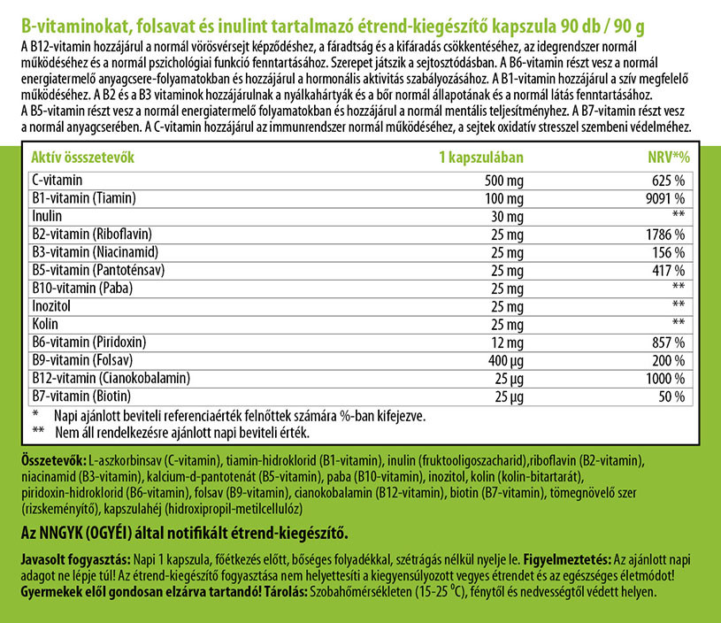 Komplex készítmény 10 értékes és létfontosságú B-vitaminnal, C-vitaminnal, Inozitollal az idegrendszer kiegyensúlyozott működéséért. Ezek a vitaminok szolgáltatják a sejtek számára az energiát, a bevitt táplálékból alakítják át. Segítenek fenntartani az idegek, a máj, a bőr, a szem és a haj egészségét, az izmok megfelelő mozgását, a gyomor- és bélrendszer szabályos működését, valamint normál agyműködést biztosítanak.